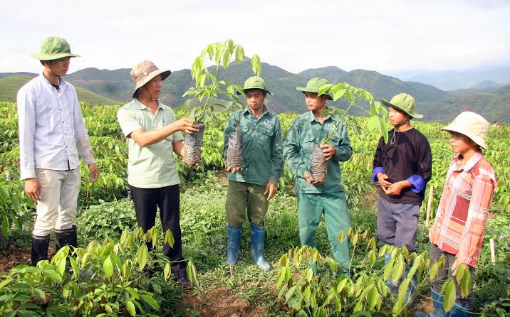Cán bộ kỹ thuật Công ty Cổ phần Cao su Dầu Tiếng Lai Châu hướng dẫn công nhân chăm sóc cây giống.