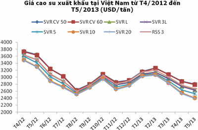Giá SVR 3L xuất khẩu đã giảm tới 862 USD/tấn tương đương 24,7% so với tháng 5 năm 2012.