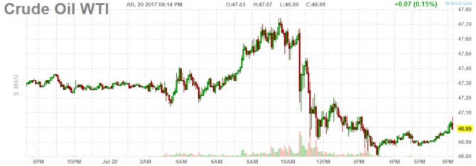 Giá dầu thô Mỹ WTI giao tháng Tám giảm 33 cent, tương đương 0,7%, xuống 46,79 USD/thùng. Trong khi đó, giá dầu WTI giao tháng Chín sụt 40 cent về 46,92 USD/thùng.