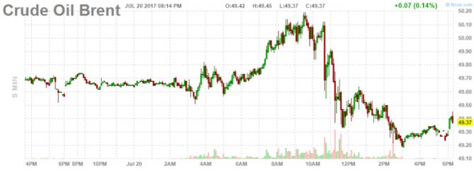 Giá dầu Brent giao tháng Chín cũng giảm 40 cent, tương đương 0,8%, xuống 49,30 USD/thùng sau khi chạm đỉnh trong phiên là 50,19 USD.