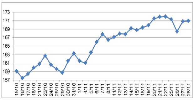 Diễn biến giá cao su giao kỳ hạn tháng 01/2020 tại sàn Tocom trong tháng 11/2019 (ĐVT: Yên/kg). Nguồn: Bộ Công Thương.