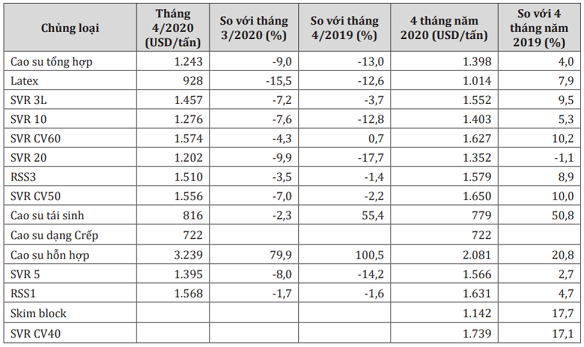 Giá xuất khẩu bình quân một số chủng loại cao su trong tháng 4 và 4 tháng đầu năm 2020.